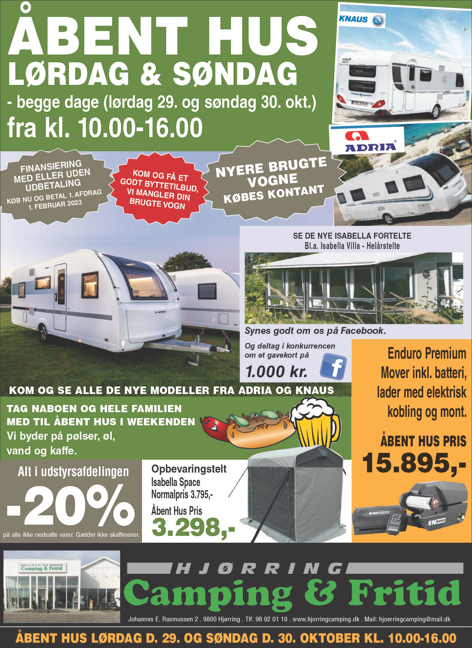 FERIE FOR ALLE 2019![]() afholdes i Messecenter Herning. Fredag og Lørdag fra 10 til 18 Søndag fra 10 til 17. Mød os på Adria's stand Hal H plads 6050 og på Knaus's stand Hal E plads 4000 Venlig Hilsen Hjørring Camping & Fritid |