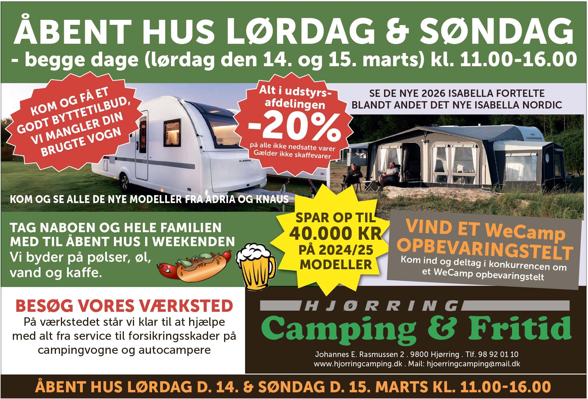 Begge dage fra Kl. 11:00 til 16:00 Kom ind og se nyhederne her i 2026 Få en campingsnak og lidt godt til ganen. |